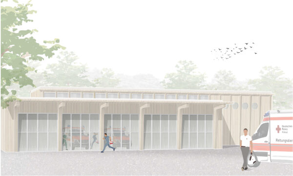 Wir freuen uns über den 2. Preis beim Wettbewerb DRK-Rettungswache am Gewerbegebiet „Hegelesberg“. Auszug aus dem Juryprotokoll: „…Mit ruhiger Selbstverständlichkeit passt sich der Neubau des DRK in seine Umgebung ein, bildet ein ruhiges Ensemble mit einer soliden Grundrissorganisation, die im Einsatzfall eine störungs- und kreuzungsfreie Wegeführung erwarten lässt.“